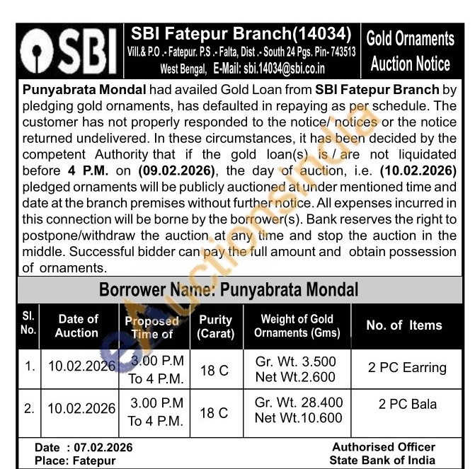 State Bank of India Gold Auctions Auction in South 24 Parganas