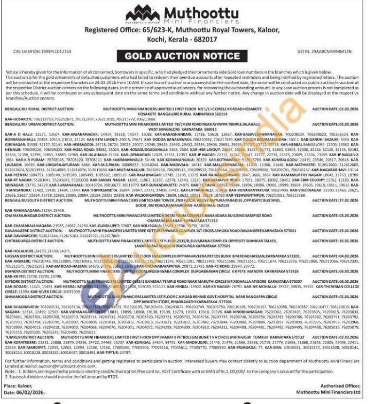 Muthoottu Mini Financiers Limited Gold Auctions Auction in Bengaluru