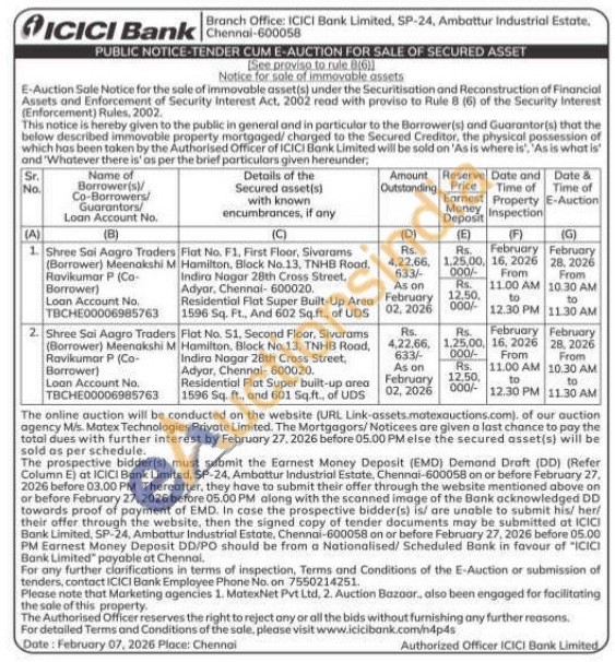 Flat No. 51, Second Floor, Sivarams Hamilton, Block No. 13, TNHB Road, Indira Nagar 28th Cross Street, Adyar, Chennai-600020. Residential Flat Super built-up area 1596 Sq. ft., and 601 Sq.ft., of UDS