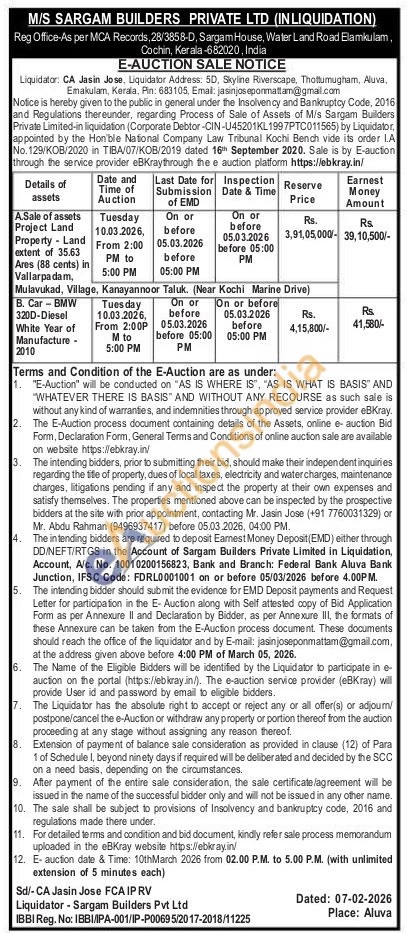 A.Sale of assets Project Land Property - Land extent of 35.63 Ares (88 cents) in Vallarpadam,Mulavukad, Village, Kanayannoor Taluk. (Near Kochi Marine Drive)