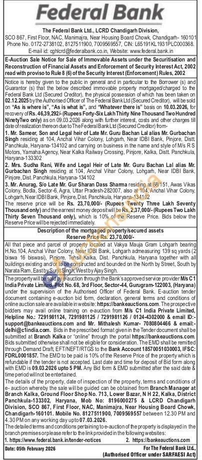 All that piece and parcel of property located at Vakya Mauja Gram Lohgarh bearing H.No. 104, Anchal Vihar Colony, Near IDBI Bank, Lohgarh admeasuring 139 sq yards (2) biswa 16 biswasi), Pinjore, Tehsil Kalka, Dist. Panchkula, Haryana together with all buildings existing and/or to be constructed and bounded on the North by Street, South by Narata Ram, Eastby Surjit Singh, Westby Ajay Singh