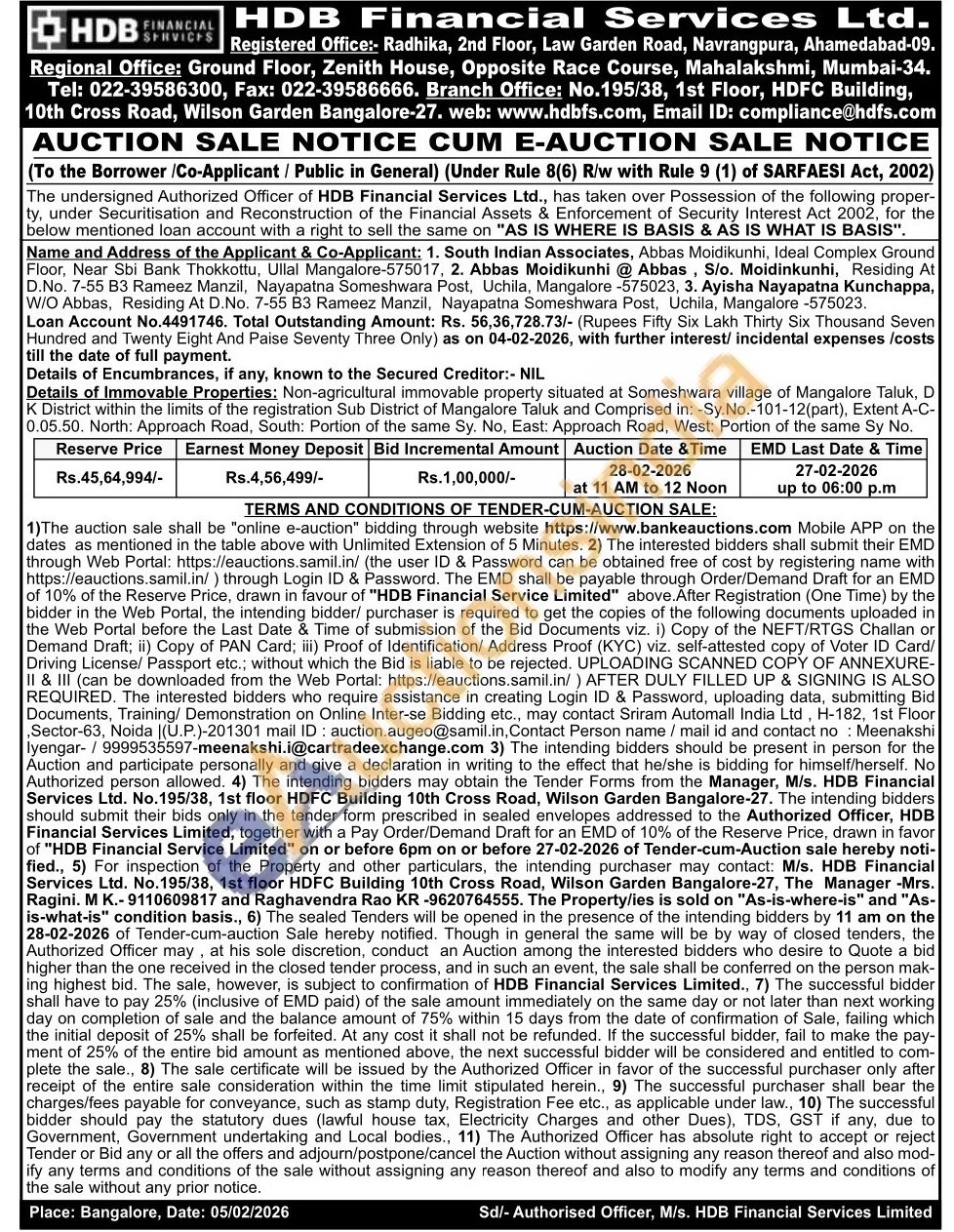 Details of Immovable Properties: Non-agricultural immovable property situated at Someshwara village of Mangalore Taluk, D K District within the limits of the registration Sub District of Mangalore Taluk and Comprised in: -Sy.No.-101-12(part), Extent A-C- 0.05.50. North: Approach Road, South: Portion of the same Sy. No, East: Approach Road, West: Portion of the same Sy No