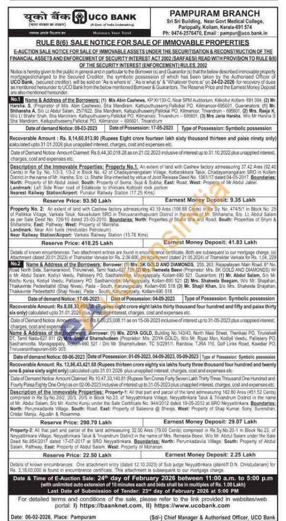 : An extent of land with Cashew factory admeasuring 43. 19 Ares (106.68 Cents) in Re Sy. No. 474/5/1 in Block No. 25 of Pallikkal Village, Varkala Taluk, Navaikulam SRO in Thiruvananthapuram District in the name of Mr. Shihansha, Sio. Lt Abdul Salam as per Sale Deed No. 728/10 dated 23-03-2010. Boundaries: North: Properties of Shahir Sha and Road, South: Properties of Shyni & Shihansha, East: Pathway, West: Property of Manisha Landmark: Near Alin fuels (Hindustan Petroleum)