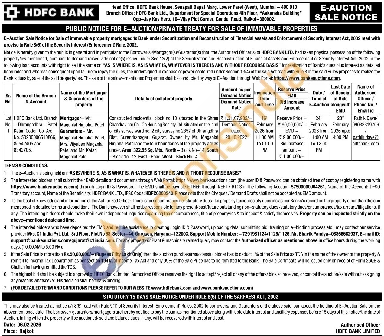 Constructed residential block no 13 situated in the Shree Chandravihar Co-Op Housing Society Ltd, situated on the land of city survey ward no. 2 city survey no 2857 of Dhrangdhra Dist. Surendranagar, Gujarat. Owned by Mr. Maganlal Hirjibhai Patel and the four boundaries of the property are as under. Area: 322.55 Sq. Mts., North-Block No-14, South -Block No-12, East-Road, West-Block No-4