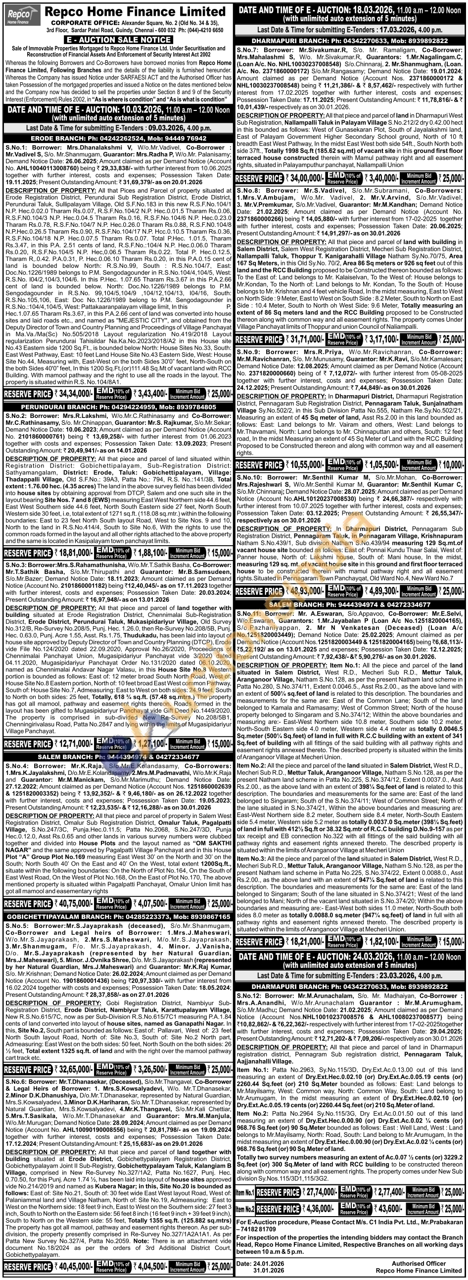 DESCRIPTION OF PROPERTY: Item No.1: All the piece and parcel of the land situated in Salem District, West R.D., Mecheri Sub R.D., Mettur Taluk, Aranganoor Village, Natham S.No.128, as per the present Natham land scheme in Patta No.280, S.No.374/11, Extent 0.0046.5., Asst Rs.2.00., as the above land with an extent of 500% sq.feet of land is related to this description. The boundaries and measurements for the same are: East of the Common Lane; South of the land belonged to Kamala and Ramasamy: West of Common Street; North of the house property belonged to Singaram and S.No.374/12; Within the above boundaries and measuring are: East-West Northern side 10.8 meter, Southern side 10.2 meter, North-South Eastern side 4.0 meter, Western side 4.4 meter as totally 0.0046.5 Sq.meter (500% Sq.feet) of land in full with R.C.C building with an extent of 341 Sq.feet of building with all fittings of the said building with all pathway rights and easement rights annexed thereto. The described property is situated within the limits of Aranganoor Village at Mecheri Union. Item No.2: All the piece and parcel of the land situated in Salem District, West R.D., Mecheri Sub R.D., Mettur Taluk, Aranganoor Village, Natham S.No. 128, as per the present Natham land scheme in Patta No.225, S.No.374/12, Extent 0.0037.0., Asst Rs.2.00., as the above land with an extent of 398% Sq.feet of land is related to this description. The boundaries and measurements for the same are: East of the land belonged to Singaram; South of the S.No.374/11; West of Common Street; North of the lane situated in S.No.374/21, Within the above boundaries and measuring are: East-West Northern side 8.2 meter, Southern side 8.4 meter, North-South Eastern side 5.4 meter, Western side 5.2 meter as totally 0.0037.0 Sq.meter (398% Sq.feet) of land in full with 412% Sq.ft or 38.32 Sq.mtr of R.C.C building D.No.9-157 as per tax receipt and EB connection No.322 with all fittings of the said building with all pathway rights and easement rights annexed thereto. The described property is situated within the limits of Aranganoor Village at Mecheri Union Item No.3: All the piece and parcel of the land situated in Salem District, West R.D., Mecheri Sub R.D., Mettur Taluk, Aranganoor Village, Natham S.No. 128, as per the present. Natham land scheme in Patta No.225, S.No.374/22, Extent 0.0088.0., Asst Rs.2.00., as the above land with an extent of 947% Sq.feet of land is related to this description. The boundaries and measurements for the same are: East of the land belonged to Singaram; South of the lane situated in S.No.374/21; West of the land belonged to Mani; North of the vacant land situated in S.No.374/20; Within the above boundaries and measuring are:-East-West both sides 11.0 meter, North-South both sides 8.0 meter as totally 0.0088.0 sq.meter (947% sq.feet) of land in full with all pathway rights and easement rights annexed thereto. The described property is situated within the limits of Aranganoor Village at Mecheri Union.