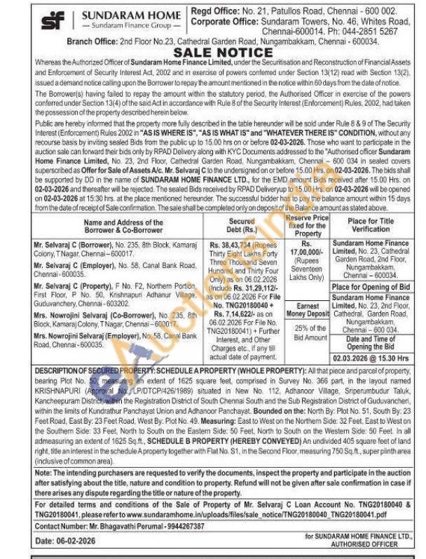 DESCRIPTION OF SECURED PROPERTY: SCHEDULE A PROPERTY (WHOLE PROPERTY): All that piece and parcel of property. bearing Plot No. 50, measuring an extent of 1625 square feet, comprised in Survey No. 366 part, in the layout named KRISHNAPURI (Approval No. LP/DTCP/426/1989) situated in New No. 112, Adhanoor Village, Sriperumbudur Taluk, Kancheepuram District, within the Registration District of South Chennai South and the Sub Registration District of Guduvancheri, within the limits of Kundrathur Panchayat Union and Adhanoor Panchayat. Bounded on the: North By: Plot No. 51, South By: 23 Feet Road, East By: 23 Feet Road, West By: Plot No. 49. Measuring: East to West on the Northem Side: 32 Feet, East to West on the Southern Side: 33 Feet, North to South on the Eastem Side: 50 Feet, North to South on the Western Side: 50 Feet, in all admeasuring an extent of 1625 Sq.ft., SCHEDULE B PROPERTY (HEREBY CONVEYED) An undivided 405 square feet of land right, title an interest in the schedule A property together with Flat No. S1, in the Second Floor, measuring 750 Sq.ft., super piinth area (inclusive of common area).