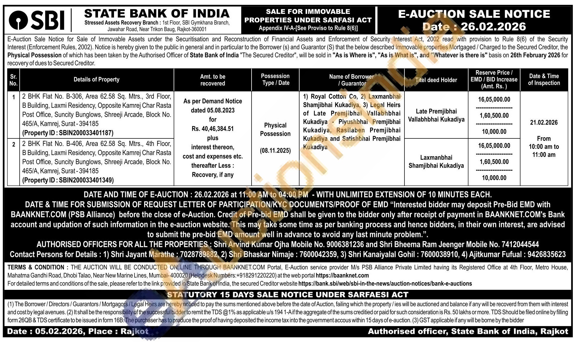 2 BHK Flat No. B-406, Area 62.58 Sq. Mtrs., 4th Floor, B Building, Laxmi Residency, Opposite Kamrej Char Rasta Post Office, Suncity Bunglows, Shreeji Arcade, Block No. 465/A, Kamrej, Surat-394185 (Property ID: SBIN200033401349)
