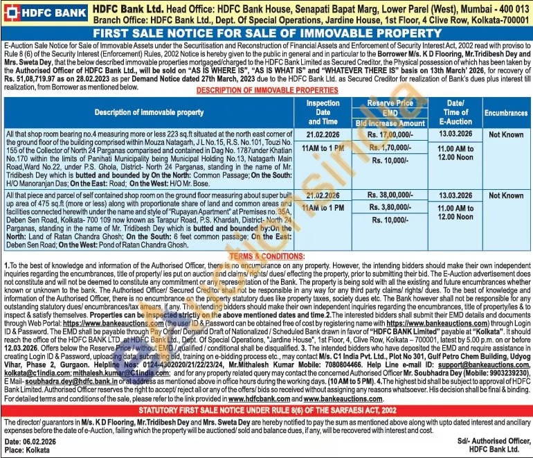 All that piece and parcel of self contained shop room on the ground floor measuring about super built up area of 475 sq.ft (more or less) along with proportionate share of land and common areas and facilities connected herewith under the name and style of "Rupayan Apartment" at Premises no. 35A, Deben Sen Road, Kolkata-700 109 now known as Tarapur Road, P.S. Khardah, District- North 24 Parganas, standing in the name of Mr. Tridibesh Dey which is butted and bounded by:On the North: Land of Ratan Chandra Ghosh, On the South: 6 feet common passage; On the East: Deben Sen Road; On the West: Pond of Ratan Chandra Ghosh.