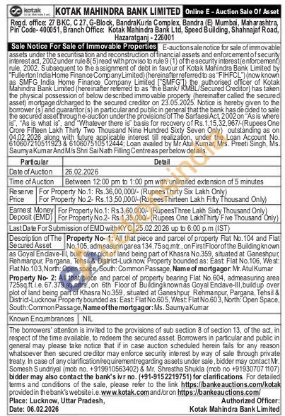 No.105, admeasuringarea 134.75sq.mtr., on First Floor of the Building known as Goyal Endave-III, built over plot of land being part of Khasra No.359, situated at Ganeshpur Rehmanpur, Pargana, Tehsil & District-Lucknow Property bounded as: East Flat No.106, West: