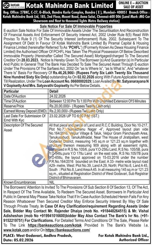 All that piece and parcel of Land and R.C.C Building, Door No. 10-217, Plot No.7, "kamadhenu Nagar -4", Approved oved layout plan vide No.164/2016, Velpur Village & Taluk, Velpur Gram Panchayath Area, Tanukusabudi, TanukuMnadal, Near The House of Jiratipallam, west Godavari District, measuring 145 sq.m or 121.23 sq.m together with structure thereon measuring 909 along with all easement rights, comprised in R.S No. 105/6, pura Y.O-25tlu Land, R.S No. 105/5B, pura Y.O-54tlu,pura Y.O 17tlu Land on the east side, R.S No.105/7B pura Y.O-65tlu, the layout approved on 15-03.2016 under the number P.R.No. 164/2016 bounded on the East: A 33- metre wide layout road A29-metre, West: Plot No.39, Land A 29, North: Plot No.6, Land A 45, South Plot No.8, Land Area A 45. In all measuring 145 sq.m or 121.23 sq.m., situated at Registration District of West Godavari, Sub Registrar District of Bhimavaram