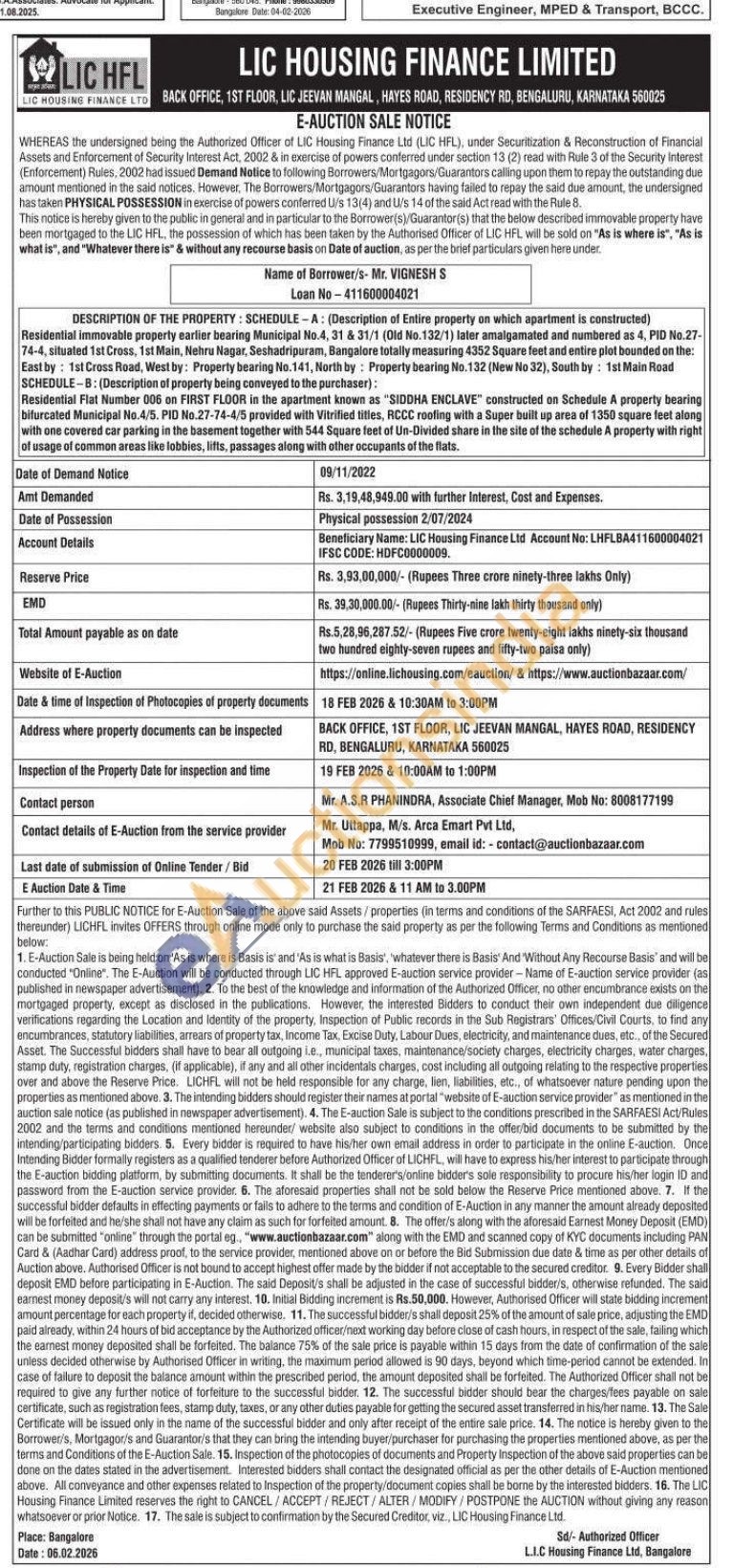 Residential immovable property earlier bearing Municipal No.4, 31 & 31/1 (Old No.132/1) later amalgamated and numbered as 4, PID No.27- 74-4, situated 1st Cross, 1st Main, Nehru Nagar, Seshadriparam, Bangalore totally measuring 4352 Square feet and entire plot bounded on the East by: Ist Cross Road, West by: Property hearing No. 141, North by Property bearing No.132 (New No 32), South by: 1st Main Road SCHEDULE-B:(Description of property being conveyed to the purchaser): Residential Flat Number 006 on FIRST FLOOR in the apartment known as "SIDDHA ENCLAVE" constructed on Schedule A property frearing bifurcated Municipal No.4/5. PID No.27-74-4/5 provided with Vitrified tilles, RCCC rooling with a Super bulll up area of 1350 square feet along with one covered car parking in the basement together with 544 Square feet