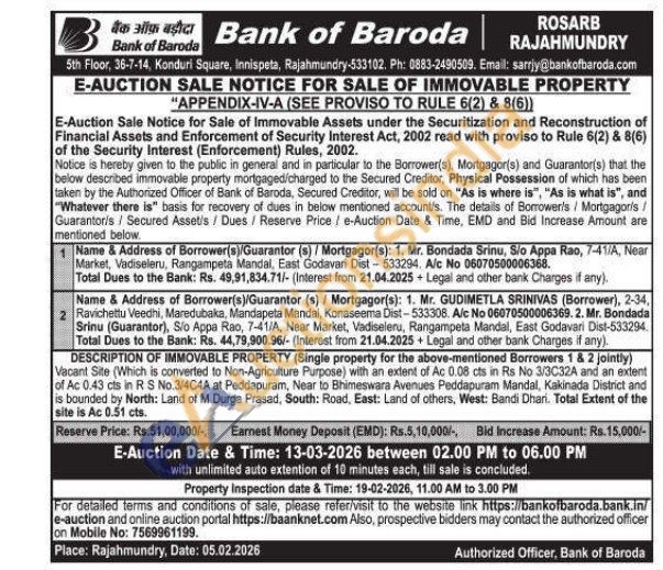 DESCRIPTION OF IMMOVABLE PROPERTY (Single property for the above-mentioned Borrowers 1 & 2 jointly) Vacant Site (Which is converted to Non-Agriculture Purpose) with an extent of Ac 0.08 cts in Rs No 3/3C32A and an extent of Ac 0.43 cts in R S No.3/4C4A at Peddapuram, Near to Bhimeswara Avenues Peddapuram Mandal, Kakinada District and is bounded by North: Land of M Durga Prasad, South: Road, East: Land of others, West: Bandi Dhari. Total Extent of the site is Ac 0.51 cts.