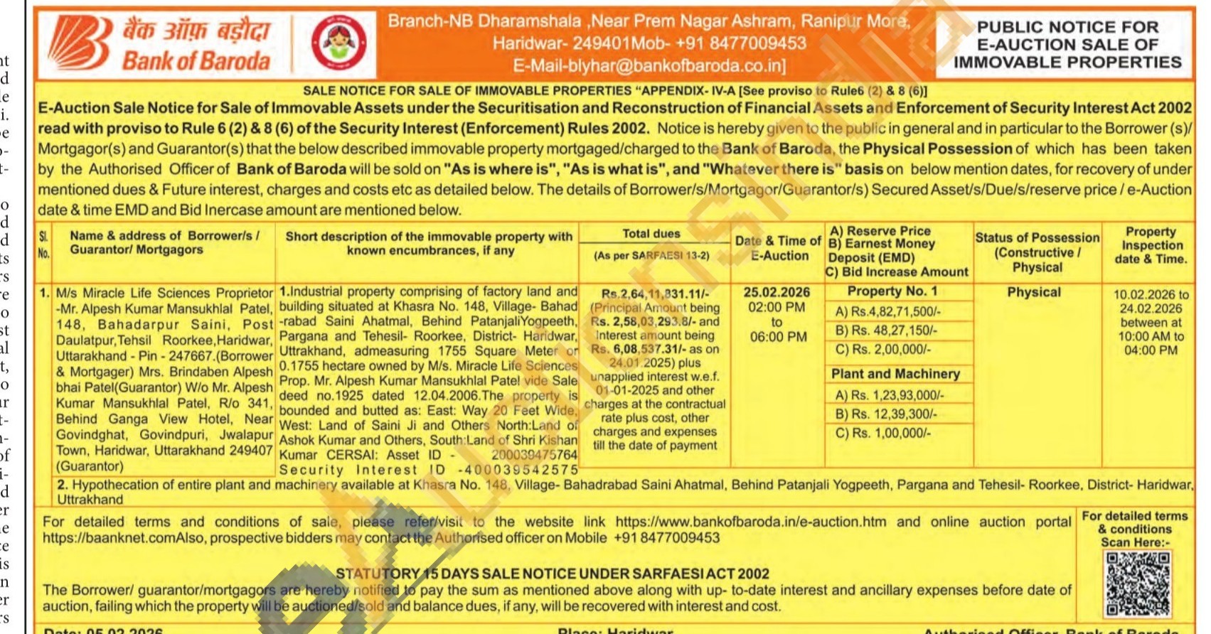 2. Hypothecation of entire plant and machinery available at Khasra No. 148, Village- Bahadrabad Saini Ahatmal, Behind Patanjali Yogpeeth, Pargana and Tehesil- Roorkee, District- Haridwar, Uttrakhand