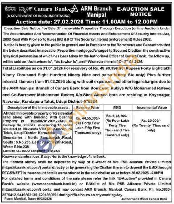 All that Immovable property of Residential land along with building with bearing Property id 152600201200122410 in Survey No. 232/2C measuring 13 cents situated at Navunda Village, Kundapura Taluk, Udupi District, Karnataka. Boundaries: North: Panchayath Road, South: S.No.235, East: Panchayath Road, West: S.No.235 Latitude 13.756472 Longitude 74.642806