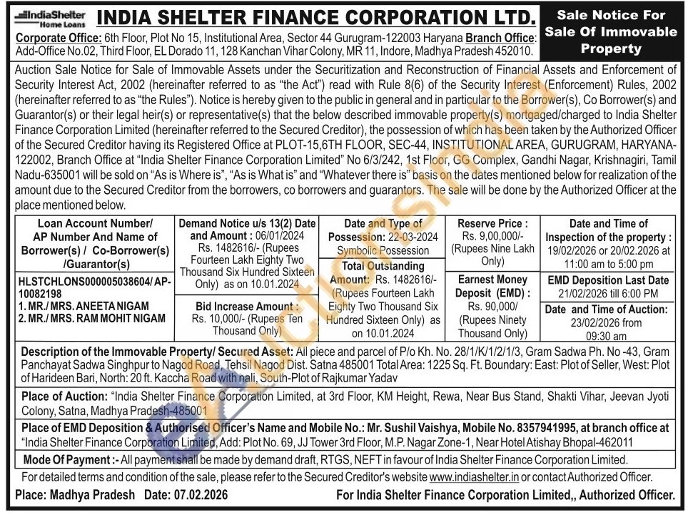Description of the Immovable Property/ Secured Asset: All piece and parcel of P/o Kh. No. 28/1/K/1/2/1/3, Gram Sadwa Ph. No -43, Gram Panchayat Sadwa Singhpur to Nagod Road, Tehsil Nagod Dist. Satna 485001 Total Area: 1225 Sq. Ft. Boundary: East: Plot of Seller, West: Plot of Harideen Bari, North: 20 ft. Kaccha Road with nali, South-Plot of Rajkumar Yadav