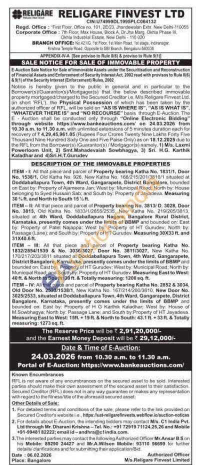ITEM-1: All that piece and parcel of Property bearing Katha No. 1831/1, Door No. 1538/1, Old Katha No. 926, New Katha No. 168/215/201/3810/1 situated at Doddaballapura Town, 4th Ward, Gangarapete, District Bangalore, bounded on East by: Property of Ajameera Jan, West by: Municipal Road; North by: House belonging to Syed Hussain Sab, and South by: Property of Jayadeva. Measuring 30% ft. and North to South 15% ft. ITEM-II: All that piece and parcel of Property bearing No. 3813/ D. 3028, Door No. 3813, Old Katha No. 1833/1/2855/2535, New Katha No. 219/205/3813, siluated at 4th Ward, Doddaballapura Nagara, Bangalore Rural District, Karnataka, presently comes under the limits of BBMP and bounded on: East by: Property of Patel Najappa: West by: Property of HT Gurudev. North by: Passage (Lane), and South by: Property of HT Gurudev. Measuring 30X33 ft. and 31X40.6 ft. ITEM All that piece and parcel of Property bearing Katha No. 1832/2854/1539 & No. 3036/3027, Door No. 3811/3027, New Katha No. 170/217/203/3811 situated at Doddaballapura Town, 4th Ward, Gangarapete, District Bangalore, Karnataka, presently comes under the limits of BBMP and bounded on, East by. Property of HT Gurudev: West by: Municipal Road, North by: Municipal Road; and South by: Property of HT Gurudev. Measuring East to West: 40 ft. & North to South: 30 ft. & Totally measuring: 1200 sq. ft. ITEM-IV: All that piece and parcel of Property bearing Katha No. 2852 & 3034, Old Door No. 2533/1538/1, New Katha No. 167/214/200/3810, New Door No. 3025/2533, situated at Doddaballapura Town, 4th Ward, Gangarapete, District Bangalore, Karnataka, presently comes under the limits of BBMP and bounded on: East by: Property of H G Karthik Kaladhar, West by: House of M.Sowbhagya: North by: Passage Lane, and South by Property of HT Jayadeva. Measuring East to West: 15ft. +19 ft. & North to South: 43.1 ft. + 33 ft. & Totally measuring: 1273 sq. ft.