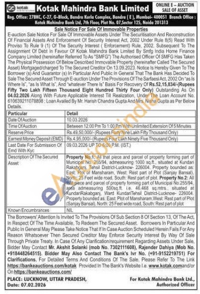 Property No.1: All that piece and parcel of property forming part of Municipal No. 255/84, admeasuring 1000 sq.ft, situated at Kundan Rakabganj, Tehsil District-Lucknow-226004, Property bounded as: East: Plot of Mansharam, West: Rest part of Plot (Sanjay Bansal). North: 25 Feet wide road. South: Rest part of plot. Property No.2: All that piece and parcel of property forming part of Municipal No.255/94, area admeasuring 500sq.ft. le 46.468 sq.mtrs, situated at Rakabganj , Ward Kundari Tehsil District-Lucknow- 226004. Property bounded as. East: Plot of Mansharam West: Rest part of Plot (Sanjay Bansal), North: 25 Feet wide road, South: Rest part of plot
