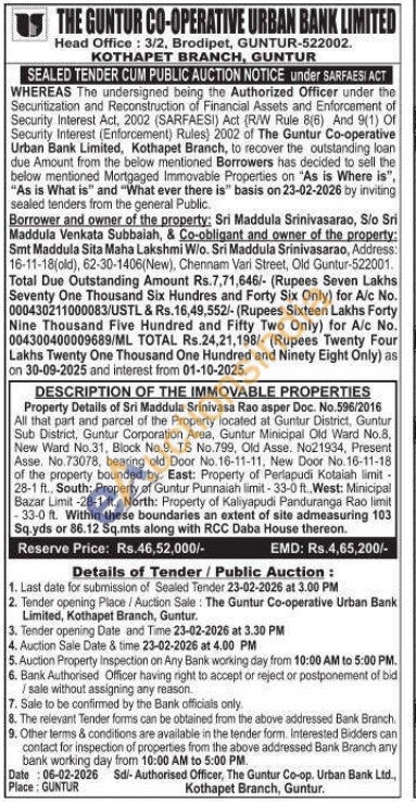 Property Details of Sri Maddula Srinivasa Rao asper Doc. No.596/2016 All that part and parcel of the Property located at Guntur District, Guntur Sub District, Guntur Corporation Area, Guntur Minicipal Old Ward No.8, New Ward No.31, Block No.9, TS No.799, Old Asse. No21934, Present Asse. No.73078, bearing old Door No.16-11-11, New Door No.16-11-18 of the property bounded by: East: Property of Perlapudi Kotaiah limit 28-1 ft., South: Property of Guntur Punnaiah limit-33-0 ft. West: Minicipal Bazar Limit-28-1 ft., North: Property of Kaliyapudi Panduranga Rao limit -33-0 ft. Within these boundaries an extent of site admeasuring 103 Sq.yds or 86.12 Sq.mts along with RCC Daba House thereon.