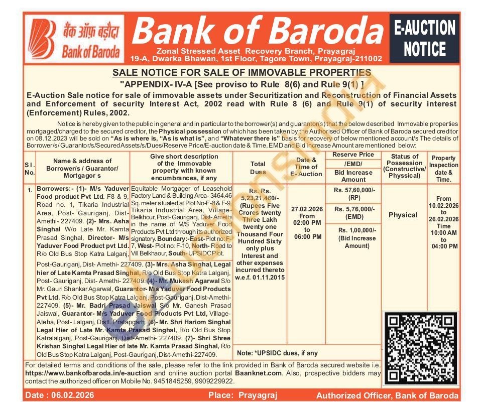 Equitable Mortgager of Leasehold Factory Land & Building Area-3464.46 Sq. meter situated at Plot No-F-8& F-9, Tikaria Industrial Area, Village-Belkhour, Post-Gauriganj, Dist-Amethi in the name of M/S Yaduver Food Products Pvt Ltd through its authorized signatory. Boundary:-East-Plot no: F-7, West-Plot no: F-10, North-Road to Vill Belkhaour, South-UPSIDCPlot.