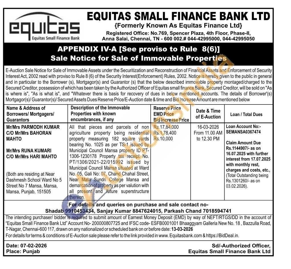 All that pieces and parcels of non agriculture property being residential property measuring 182 square yards bearing No. 1025 as per TS-1 issued by Municipal Council Mansa property ID PT-1306-1230178 Property tax receipt No. PT/1306/2021-22/015992 issued by Municipal Council Mansa situated at Ward No. 05, Gali No: 07, Chand Chahal Street, Near Mata Sundri College Mansa and demarcation of property as per valution with all present and future superstructure thereon.