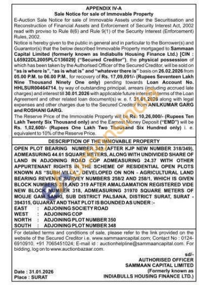 OPEN PLOT BEARING NUMBER 349 (AFTER KJP NEW NUMBER 318/349). ADMEASURING 44.61 SQUARE METERS, ALONG WITH UNDIVIDED SHARE OF LAND IN ADJOINING ROAD COP ADMEASURING 24.37 WITH OTHER APPURTENANT RIGHTS IN THE SCHEME OF RESIDENTIAL OPEN PLOTS KNOWN AS "SUBH VILLA", DEVELOPED ON NONAGRICULTURAL LAND BEARING REVENUE SURVEY NUMBERS 258/2 AND 258/1, WHICH IS GIVEN BLOCK NUMBERS 318 AND 319 AFTER AMALGAMATION REGISTERED VIDE NEW BLOCK NUMBER 318, ADMEASURING 31970 SQUARE METERS OF MOUJE GAM SANKI, SUB DISTRICT PALSANA, DISTRICT SURAT, SURAT