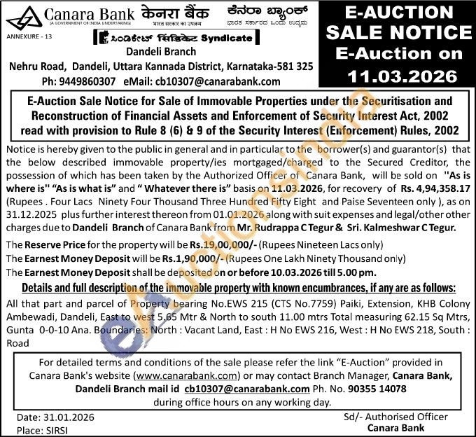 All that part and parcel of Property bearing No.EWS 215 (CTS No.7759) Paiki, Extension, KHB Colony Ambewadi, Dandeli, East to west 5.65 Mtr & North to south 11.00 mtrs Total measuring 62.15 Sq Mtrs, Gunta 0-0-10 Ana. Boundaries: North: Vacant Land, East: H No EWS 216, West: H No EWS 218, South: Road