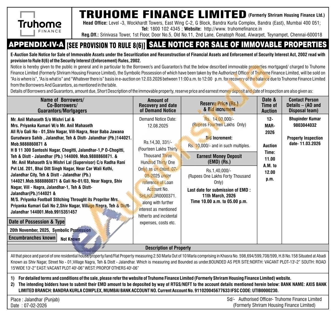 All that piece and parcel of one residential house/property/land/Flat Property measuring 2.50 Marla Out of 10 Marla comprising in Khasra No. 598,694/599,708/599, H.B No. 158 Situated at Abadi Known as Shiv Nagar, Street No-01, Village Nagra, Teh & Distt - Jalandhar. Which is measuring and Bounded as under.BOUNDED AS PER SITE:NORTH: VACANT PLOT-13-2" SOUTH: ROAD 15'WIDE 13-2" EAST: VACANT PLOT 40'-06" WEST: PROPOF OTHERS 40'-06"