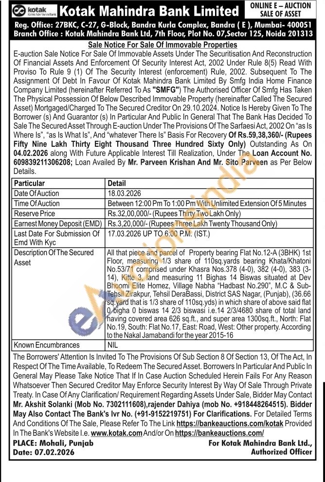 All that piece and parcel of Property bearing Flat No. 12-A (3BHK) 1st Floor, measuring 1/3 share of 110sq.yards bearing Khata/Khatoni No.53/71 comprised under Khasra Nos.378 (4-0), 382 (4-0), 383 (3-14), Kitte 3, land measuring 11 Bighas 14 Biswas situated at Dev Bhoomi Elite Homez, Village Nabha "Hadbast No.290", M.C & Sub-Tehsil Zirakpur, Tehsil DeraBassi, District SAS Nagar, (Punjab), (36.66 sq.yard that is 1/3 share of 110sq.yds) in which share of above said flat 10 bigha 0 biswas 14 2/3 biswasi i.e.14 2/3/4680 share of total land having covered area 626 sq.ft., and super area 1300sq.ft., North: Flat No.19, South: Flat No.17, East: Road, West: Other property. According to the Nakal Jamabandi for the year 2015-16