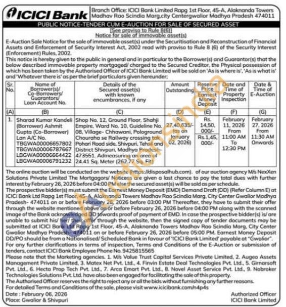 Shop No. 12, Ground Floor, Shahji Empire, Ward No. 10, Guideline No. 08, Village- Chhawani, Pologround Chouraha se Railway crossing tak Pohari Road side, Shivpuri, Tehsil and District Shivpuri, Madhya Pradesh-473551. Admeasuring an area of 24.41 Sq. Meter (262.77 Sq. Fit)