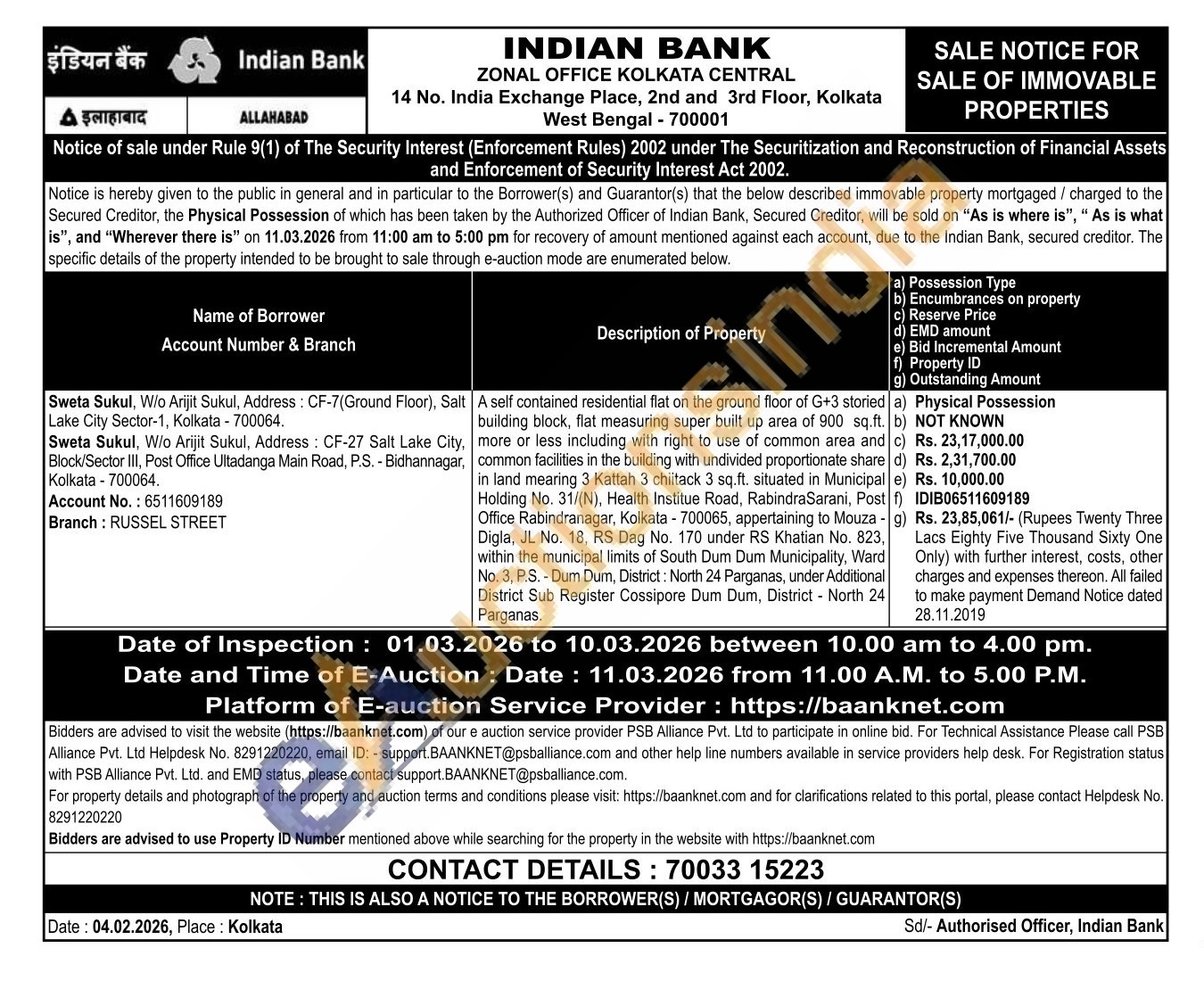 A self contained residential flat on the ground floor of G+3 storied building block, flat measuring super built up area of 900 sq.ft. more or less including with right to use of common area and common facilities in the building with undivided proportionate share in land mearing 3 Kattah 3 chiitack 3 sq.ft. situated in Municipal Holding No. 31/(N), Health Institue Road, RabindraSarani, Post Office Rabindranagar, Kolkata - 700065, appertaining to Mouza Digla, JL No. 18, RS Dag No. 170 under RS Khatian No. 823, within the municipal limits of South Dum Dum Municipality, Ward No. 3, P.S. - Dum Dum, District: North 24 Parganas, under Additional District Sub Register Cossipore Dum Dum, District - North 24 Parganas.