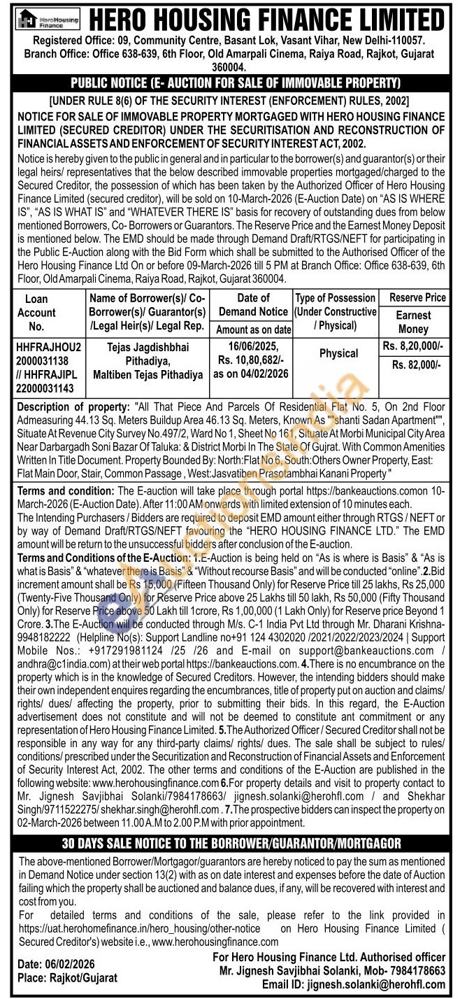 Description of property: "All That Piece And Parcels Of Residential Flat No. 5, On 2nd Floor Admeasuring 44.13 Sq. Meters Buildup Area 46.13 Sq. Meters, Known As "shanti Sadan Apartment", Situate At Revenue City Survey No. 497/2, Ward No 1, Sheet No 161, Situate At Morbi Municipal City Area Near Darbargadh Soni Bazar Of Taluka: & District Morbi In The State Of Gujrat. With Common Amenities Written In Title Document. Property Bounded By: North: Flat No 6, South: Others Owner Property, East: Flat Main Door, Stair, Common Passage, West: Jasvatiben Prasotambhai Kanani Property