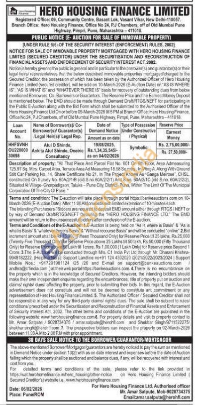 Description of property: "All That Piece And Parcel Flat No. 601 On 6th Floor, Area Admeasuring 125.97 Sq. Mins. Carpet Area, Terrace Area Ad Measuring 18.58 Sq.mtrs, In Wing A, Along With Ground Stilt Car Parking No. 14, Share Certificate No 21, In The Project Known As "Ganga Melrose", CHSL constructed On Survey No. 80A/2/1/B (old S.no. 60A/2/2/1) And Sino. 60A/2/1C (old Sno. 60A/2/2/2 Situated At Village-Ghorpadigaon Taluka-Pune City, District-Pune, Within The Limit Of The Muniopal Corporation Of The City Of Pune