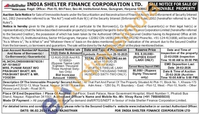 Description Of The Immovable Property/ Secured Asset: All That Part And Parcel Of The Property Situated At Plot-11, Block No. 1, Khasra-173 Patrawali-47/2012-13, Moja Tausar, Nagaur 341001 Rajasthan. Adm Area: 1250 Sq. Ft. Boundary: - East: -Plot-12, West: - Plot-10, North: Other Khasra Land, South:-Road 30 Ft