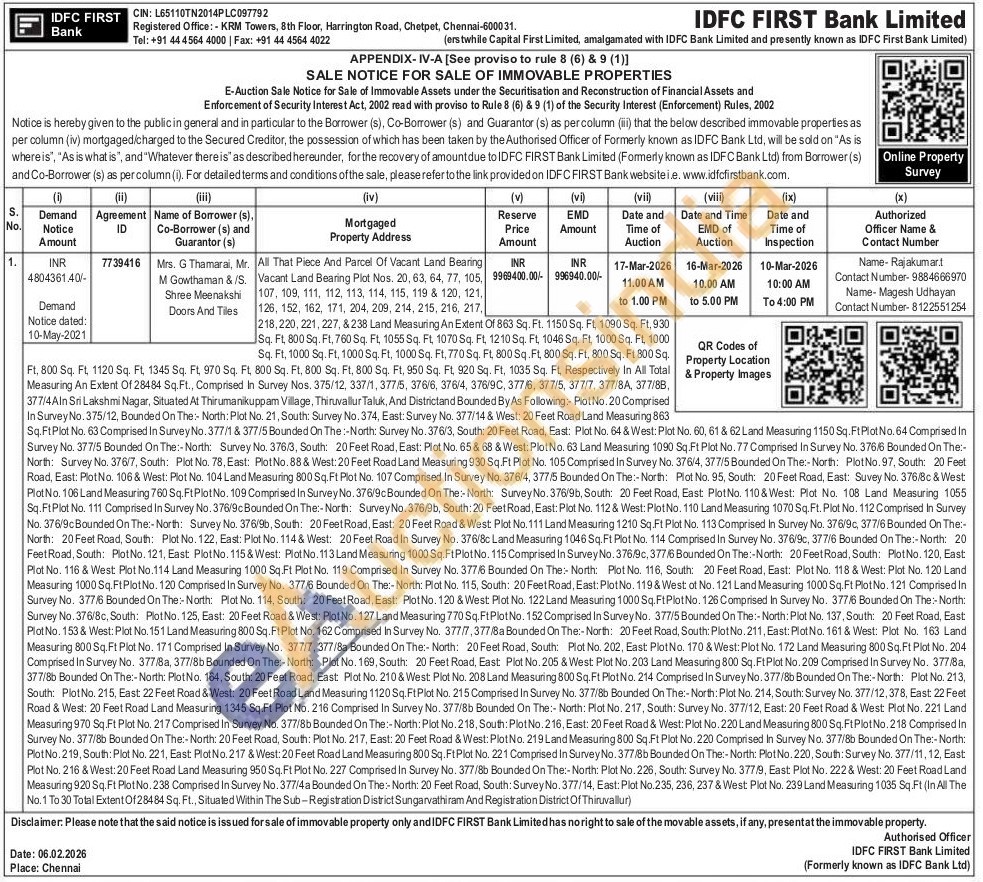 All That Piece And Parcel Of Vacant Land Bearing Vacant Land Bearing Plot Nos. 20, 63, 64, 77, 105, 107, 109, 111, 112, 113, 114, 115, 119 & 120, 121, 126, 152, 162, 171, 204, 209, 214, 215, 216, 217,218, 220, 221, 227, & 238 Land Measuring An Extent Of 863 Sq. Ft. 1150 Sq. Ft, 1090 Sq. Ft, 930 Sq. Ft, 800 Sq. Ft, 760 Sq. Ft, 1055 Sq. Ft, 1070 Sq. Ft, 1210 Sq. Ft, 1046 Sq. Ft, 1000 Sq. Ft, 1000 Sq. Ft, 1000 Sq. Ft, 1000 Sq. Ft, 1000 Sq. Ft, 770 Sq. Ft, 800 Sq. Ft, 800 Sq. Ft, 800 Sq. Ft 800 Sq. Ft, 800 Sq. Ft, 1120 Sq. Ft, 1345 Sq. Ft, 970 Sq. Ft, 800 Sq. Ft, 800 Sq. Ft, 800 Sq. Ft, 950 Sq. Ft, 920 Sq. Ft, 1035 Sq. Ft, Respectively In All Total Measuring An Extent Of 28484 Sq.Ft., Comprised In Survey Nos. 375/12, 337/1, 377/5, 376/6, 376/4, 376/9C, 377/6, 377/5, 377/7, 377/8A, 377/8B, 377/4 Aln Sri Lakshmi Nagar, Situated At Thirumanikuppam Village, Thiruvallur Taluk, And Districtand Bounded By As Following:- Plot No. 20 Comprised In Survey No. 375/12, Bounded On The:- North: Plot No. 21, South: Survey No. 374, East: Survey No. 377/14 & West: 20 Feet Road Land Measuring 863. Sq.Ft Plot No. 63 Comprised In Survey No. 377/1 & 377/5 Bounded On The:-North: Survey No. 376/3, South: 20 Feet Road, East: Plot No. 64 & West: Plot No. 60, 61 & 62 Land Measuring 1150 Sq. Ft Plot No. 64 Comprised In Survey No. 377/5 Bounded On The:-North: Survey No. 376/3, South: 20 Feet Road, East: Plot No. 65 & 68 & West: Plot No. 63 Land Measuring 1090 Sq.Ft Plot No. 77 Comprised In Survey No. 376/6 Bounded On The:-North: Survey No. 376/7, South: Plot No. 78, East: Plot No. 88 & West: 20 Feet Road Land Measuring 930 Sq. Ft Plot No. 105 Comprised In Survey No. 376/4, 377/5 Bounded On The:-North: Plot No. 97, South: 20 Feet Road, East: Plot No. 106 & West: Plot No. 104 Land Measuring 800 Sq. Ft Plot No. 107 Comprised In Survey No. 376/4, 377/5 Bounded On The:-North: Plot No. 95, South: 20 Feet Road, East: Suvey No. 376/8c & West Plot No. 106 Land Measuring 760 Sq. Ft Plot No. 109 Comprised In Survey No. 376/9c Bounded On The: North: Survey No. 376/9b, South: 20 Feet Road, East: Plot No. 110 & West: Plot No. 108 Land Measuring 1055 Sq. FtPlot No. 111 Comprised In Survey No. 376/9c Bounded On The:-North: Survey No. 376/9b, South: 20 Feet Road, East: Plot No. 112 & West: Plot No. 110 Land Measuring 1070 Sq. Ft. Plot No. 112 Comprised In Survey No. 376/9c Bounded On The: North: Survey No. 376/9b, South: 20 Feet Road, East: 20 Feet Road & West: Plot No. 111 Land Measuring 1210 Sq.Ft Plot No. 113 Comprised In Survey No. 376/9c, 377/6 Bounded On The:-North: 20 Feet Road, South: Plot No. 122, East: Plot No. 114 & West: 20 Feet Road In Survey No. 376/8c Land Measuring 1046 Sq. Ft Plot No. 114 Comprised In Survey No. 376/9c, 377/6 Bounded On The: North: 20 Feet Road, South: Plot No. 121, East Plot No. 115 & West: Plot No. 113 Land Measuring 1000 Sq. FtPlot No. 115 Comprised In Survey No. 376/9c, 377/6 Bounded On The:-North: 20 Feet Road, South: Plot No. 120, East Plot No. 116 & West: Plot No.114 Land Measuring 1000 Sq.Ft Plot No. 119 Comprised In Survey No. 377/6 Bounded On The North: Plot No. 116, South: 20 Feet Road, East: Plot No. 118 & West: Plot No. 120 Land Measuring 1000 Sq. FtPlot No. 120 Comprised In Survey No. 377/6 Bounded On The:-North: Plot No. 115, South: 20 Feet Road, East: Plot No. 119 & West of No. 121 Land Measuring 1000 Sq. Ft Plot No. 121 Comprised In Survey No. 377/6 Bounded On The:- North: Plot No. 114, South: 20 Feet Road, East: Plot No. 120 & West: Plot No. 122 Land Measuring 1000 Sq. FtPlot No. 126 Comprised In Survey No. 377/6 Bounded On The:- North: Survey No. 376/8c, South: Plot No. 125, East: 20 Feet Road & West: Plot No. 127 Land Measuring 770 Sq. Ft Plot No. 152 Comprised In Survey No. 377/5 Bounded On The:- North: Plot No. 137, South: 20 Feet Road, East Plot No. 153 & West: Plot No. 151 Land Measuring 800 Sq. FtPlot No. 162 Comprised In Survey No. 377/7, 377/8a Bounded On The:-North: 20 Feet Road, South: Plot No. 211, East: Plot No. 161 & West: Plot No. 163 Land Measuring 800 Sq. Ft Plot No. 171 Comprised In Survey No. 377/7, 377/Ba Bounded On The:- North: 20 Feet Road, South: Plot No. 202, East Plot No. 170 & West: Plot No. 172 Land Measuring 800 Sq. Ft Plot No. 204 Comprised In Survey No. 377/8a, 377/8b Bounded On The:-North: Plot No. 169, South: 20 Feet Road, East: Plot No. 205 & West: Plot No. 203 Land Measuring 800 Sq. Ft Plot No. 209 Comprised In Survey No. 377/8a, 377/8b Bounded On The:-North: Plot No. 164, South: 20 Feet Road, East Plot No. 210 & West: Plot No. 208 Land Measuring 800 Sq. Ft Plot No. 214 Comprised In Survey No. 377/8b Bounded On The:-North: Plot No. 213, South: Plot No. 215, East 22 Feet Road & West: 20 Feet Road Land Measuring 1120 Sq. FtPlot No. 215 Comprised In Survey No. 377/8b Bounded On The:-North: Plot No. 214, South: Survey No. 377/12, 378, East 22 Feet Road & West: 20 Feet Road Land Measuring 1345 Sq.Ft Plot No. 216 Comprised In Survey No. 377/8b Bounded On The:- North: Plot No. 217, South: Survey No. 377/12, East: 20 Feet Road & West: Plot No. 221 Land Measuring 970 Sq. Ft Plot No. 217 Comprised In Survey No. 377/8b Bounded On The:- North: Plot No. 218, South: Plot No. 216, East: 20 Feet Road & West: Plot No. 220 Land Measuring 800 Sq. Ft Plot No. 218 Comprised In Survey No. 377/8b Bounded On The:-North: 20 Feet Road, South: Plot No. 217, East: 20 Feet Road & West: Plot No. 219 Land Measuring 800 Sq.Ft Plot No. 220 Comprised In Survey No. 377/8b Bounded On The:-North: Plot No. 219, South: Plot No. 221, East: Plot No. 217 & West: 20 Feet Road Land Measuring 800 Sq. Ft Plot No. 221 Comprised In Survey No. 377/8b Bounded On The:- North: Plot No. 220, South: Survey No. 377/11, 12, East Plot No. 216 & West: 20 Feet Road Land Measuring 950 Sq. Ft Plot No. 227 Comprised In Survey No. 377/8b Bounded On The:- North: Plot No. 226, South: Survey No. 377/9, East Plot No. 222 & West: 20 Feet Road Land Measuring 920 Sq. Ft Plot No. 238 Comprised In Survey No. 377/4 a Bounde