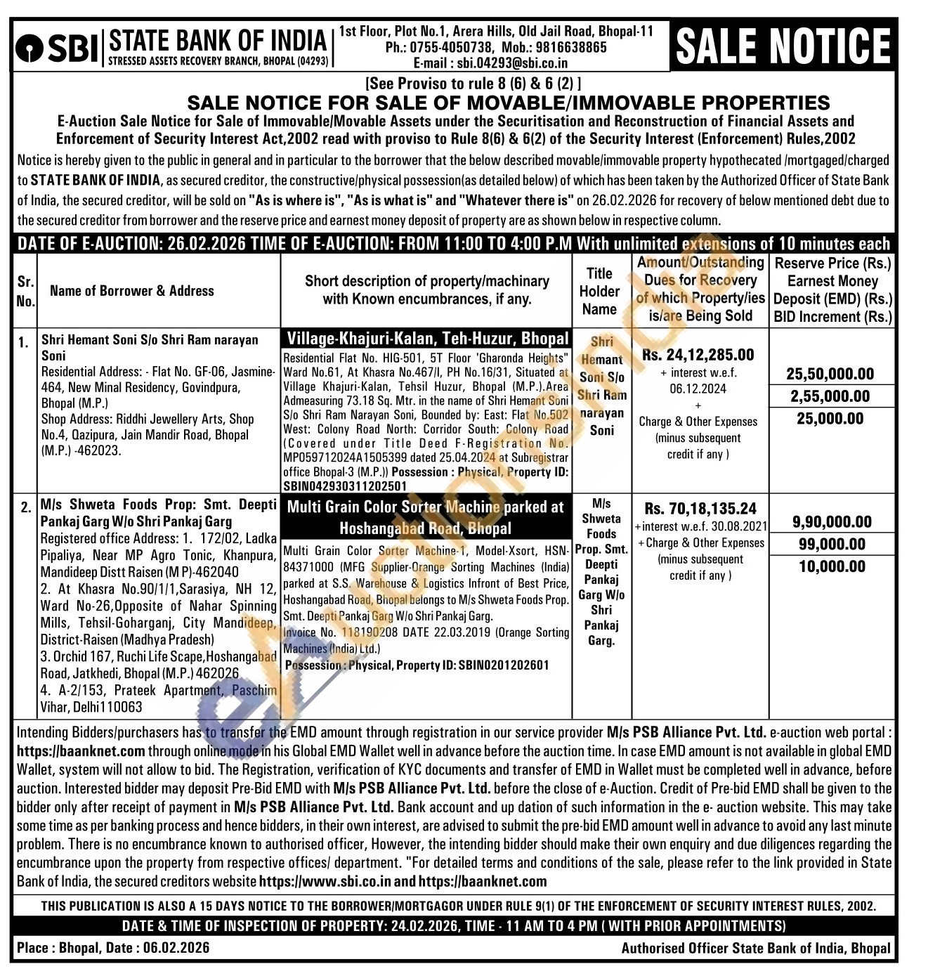 Residential Flat No. HIG-501, 5T Floor 'Gharonda Heights" Ward No.61, At Khasra No.467/I, PH No. 16/31, Situated at Village Khajuri-Kalan, Tehsil Huzur, Bhopal (M.P.).Area Admeasuring 73.18 Sq. Mtr. in the name of Shri Hemant Soni Sio Shri Ram Narayan Soni, Bounded by: East: Flat No.502 West: Colony Road North: Corridor South: Colony Road (Covered under Title Deed F-Registration No. MP059712024A1505399 dated 25.04.2024 at Subregistrar office Bhopal-3 (M.P.)) Possession: Physical, Property ID: SBIN042930311202501