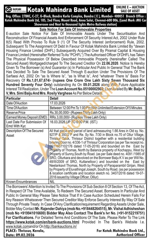 All that piece and parcel of land admeasuring 1.66 Ares in Old sy. No. 927/P & 350/2 P and Re. Sy No. 7/30 in Block no.70 of Ollur Village, Thrissur Taluk, Thrissur District together with a residential building bearing Door no. 4/336-1 of Thrissur Corporation (as per Tax receipt no. 06/11607102176 dated 17-05-2016) and bounded on the East by Property of Thomas, North by Balance property of Kochappu, West by Property of Sunny, South by Road. (as per Sale deed no. 4091/1985 of SRO, Ollurkara and devolved on the Borrower Baiju KV as per Will No. 48/111/2009 of SRO, Kuttanelloor.) and bounded on the East by Neelankavil Thomas, North by Property of Paraparambil Girijan, West by Property of Eluvathingal Joseph, South by Road. (as per possession & location certificate and location sketch no. 3407/2016 dated 19-07-2016 issued by Village Officer, Olllur)