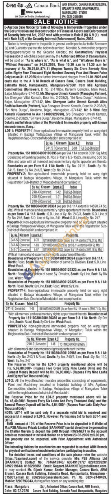 Details and full description of the Movable & Immovable property with known encumbrances, if any.: LOT-2: All the Hypothecated movable properties consisting of equipments. Plant and Machinery installed in Industrial building of M/s Agribase Commodities situated in Badaga Yedapadavu village of Mangaluru Taluk within the registration subdistrict of Moodabidri