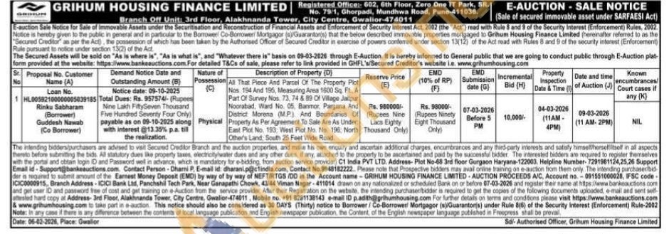 All That Piece And Parcel Of The Property Plot Property As Per Agreement To Sale Are As Under Nos. 154 And 155, Measuring Area 1600 Sq Ft. A Part Of Survey Nos. 73, 74 & 88 Of Village Jaitpur Noorabad, Ward No. 05, Banmor, Pargana And District Morena (MP) And Boundaries Of East Plot No. 193 West Plot No. No. 196. North Other's Land South 25 Feet Wide Road