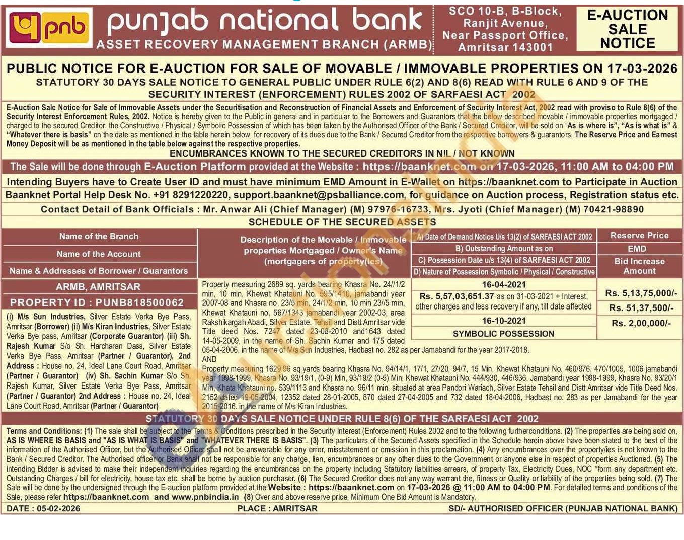 Property measuring 2689 sq. yards bearing Khasra No. 24/11/2 min, 10 min, Khewat Khatauni No. 595/1410, jamabandi year 2007-08 and Khasra no. 23/5 min, 24/1/2 min, 10 min 23//5 min, Khewat Khatauni no. 567/1343 jamabandi year 2002-03, area Rakshikargah Abadi, Silver Estate, Tehsil and Distt Amritsar vide Title deed Nos. 7247 dated 23-08-2010 and1643 dated. 14-05-2009, in the name of Sh. Sachin Kumar and 175 dated 05-04-2006, in the name of M/s Sun Industries, Hadbast no. 282 as per Jamabandi for the year 2017-2018. AND