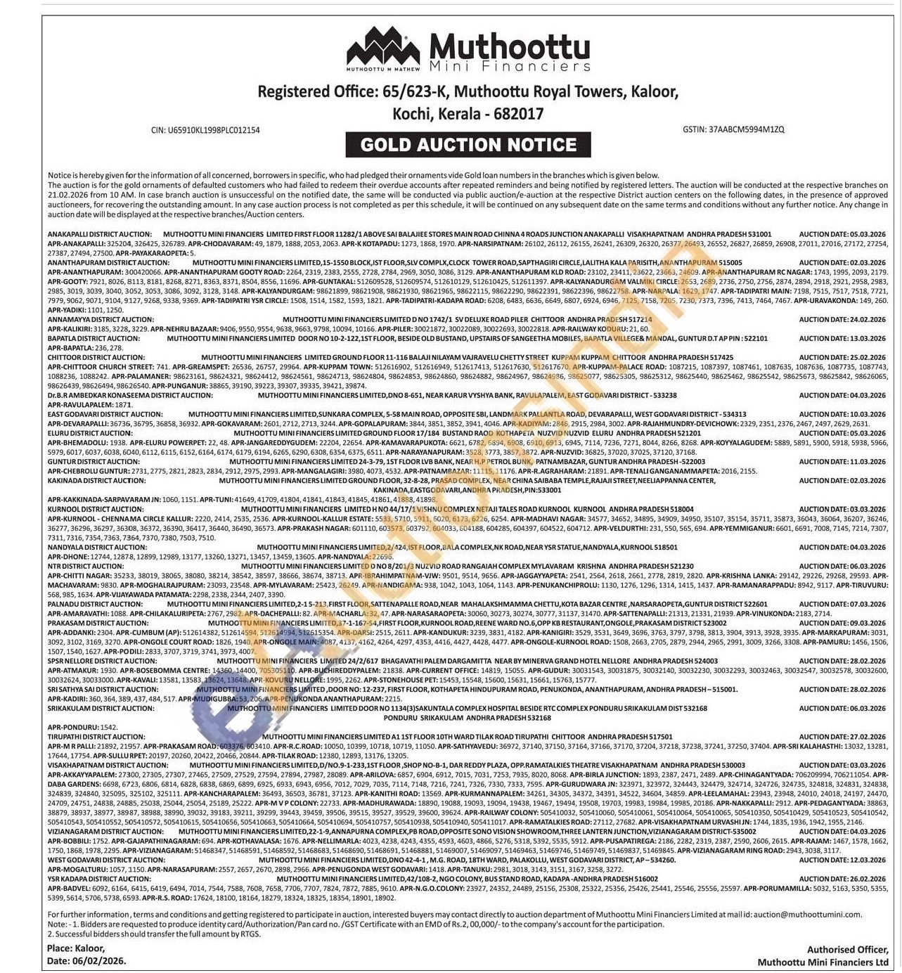 Muthoottu Mini Financiers Limited Gold Auctions Auction in Anakapalli