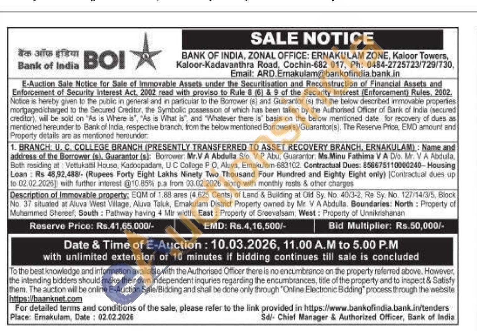Description of Immovable property; EQM of 1.88 ares (4.625 Cents) of Land & Building at Old Sy. No. 40/3-2, Re Sy. No. 127/14/3/5, Block No. 37 situated at Aluva West Village, Aluva Taluk, Emakulam District Property owned by Mr. V A Abdulla. Boundaries: North: Property of Muhammed Shereef, South: Pathway having 4 Mtr width, East: Property of Sreevalsam, West: Property of Unnikrishanan