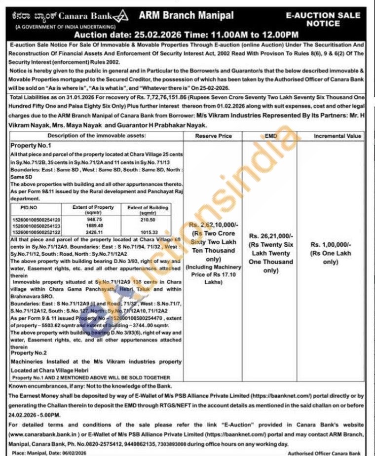 All that piece and parcel of the property located at Chara Village 25 cents in Sy No.71/2B, 35 cents in Sy.No. 71/2A and 11 cents in Sy.No. 71/13 Boundaries: East: Same SD, West: Same SD, South: Same SD, North Same SD The above properties with building and all other appurtenances thereto. As per Form 9&11 issued by the Rural development and Panchayat Raj department All that piece and parcel of the property located at Chara Village 60 cents in Sy.No.71/12A9. Boundaries: East: S No.71/94, 71/32, West: Sy.No. 71/12, South: Road, North: Sy.No.71/12A2 The above property with building bearing D.No 3/93, right of way and water, Easement rights, etc. and all other appurtenances attached therein Immovable property situated at Sy.No.71/12A9 136 cents in Chara village within Chara Gama Panchayath, Hebri Taluk and within Brahmavara SRO. Boundaries: East: S No.71/12A9 (i) and Road, 71/32, West: S.No.71/7, S.No. 71/12A12, South: S.No. 127, North: Sy.No. 71/12A10, 71/12A2 As per Form 9 & 11 issued Property No-152600100500254470, extent of property-5503.62 sqmtr and extent of building-3744.00 sqmtr. The above property with building bearing D.No 3/93(6), right of way and water, Easement rights, etc. and all other appurtenances attached therein Property No.2 Machineries Installed at the Mis Vikram industries property Located at Chara Village Hebri Property No.1 AND 2 MENTIONED ABOVE WILL BE SOLD TOGETHER