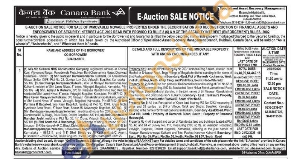 Property No 2:All that part and parcel of Residential land and building at Plot No 58 of Sy.No. 1820/B admeasuring 1162 Sq.fts situated Near Nekar Street, Jamakhandi Road Biligi Village, Bagalkot district standing in the joint names of Sri Narayan Ramakrishna Rao Kulkarni and Smt Bindurao V Kulkarni, Boundary:- East: Tanksali's Property. West: 9 meters road. North: Plot No 59, South: Plot No 57.
