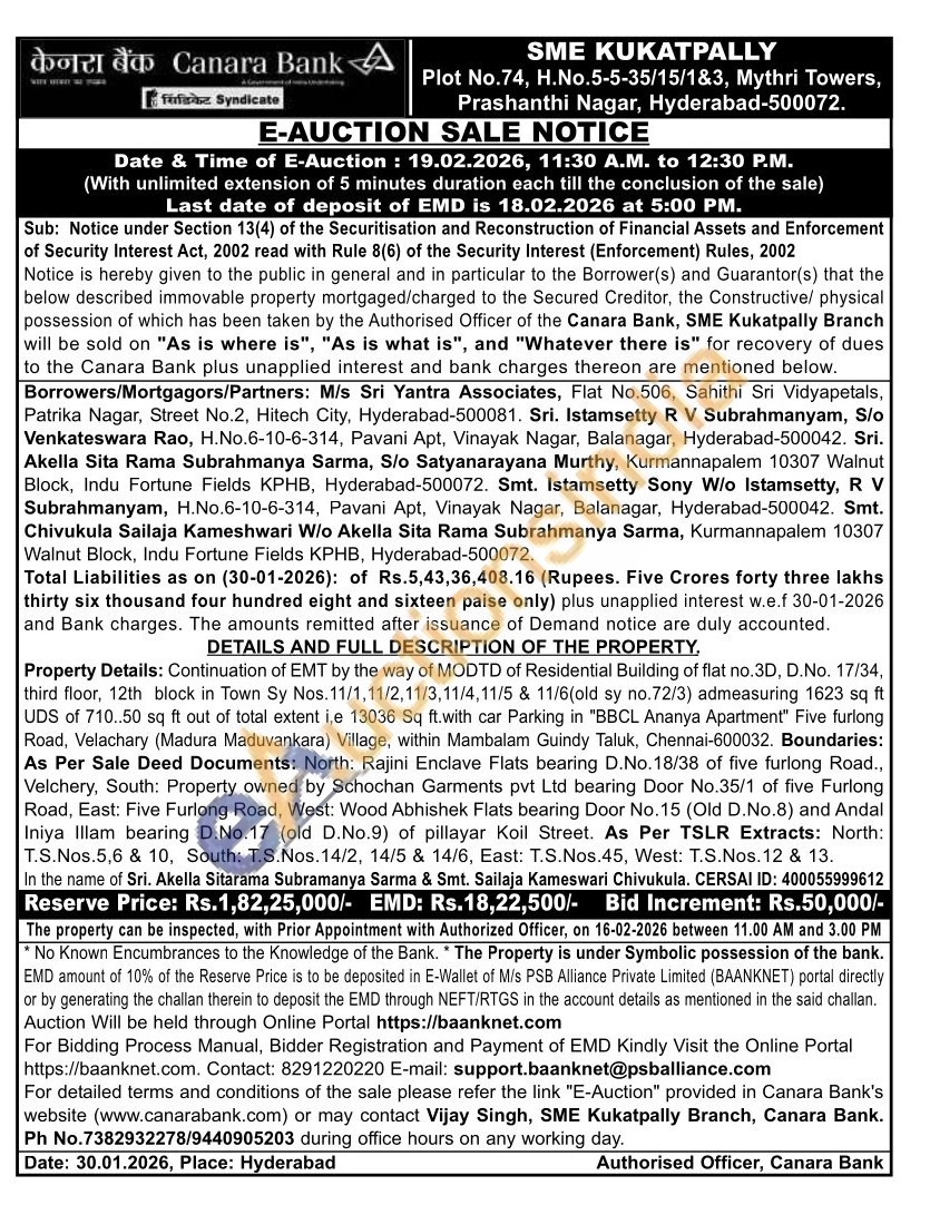 Property Details: Continuation of EMT by the way of MODTD of Residential Building of flat no.3D, D.No. 17/34, third floor, 12th block in Town Sy Nos. 11/1,11/2,11/3, 11/4,11/5 & 11/6(old sy no.72/3) admeasuring 1623 sq ft UDS of 710..50 sq ft out of total extent i,e 13036 Sq ft.with car Parking in "BBCL Ananya Apartment" Five furlong Road, Velachary (Madura Maduvankara) Village, within Mambalam Guindy Taluk, Chennai-600032. Boundaries: As Per Sale Deed Documents: North: Rajini Enclave Flats bearing D.No.18/38 of five furlong Road., Velchery, South: Property owned by Schochan Garments pvt Ltd bearing Door No.35/1 of five Furlong Road, East: Five Furlong Road, West: Wood Abhishek Flats bearing Door No.15 (Old D.No.8) and Andal Iniya Illam bearing D.No.17 (old D.No.9) of pillayar Koil Street. As Per TSLR Extracts: North: T.S.Nos.5,6 & 10, South: T.S.Nos. 14/2, 14/5 & 14/6, East: T.S.Nos. 45, West: T.S.Nos. 12 & 13. In
