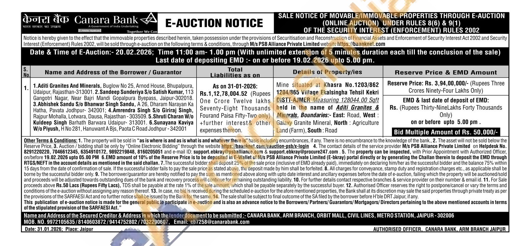 Mine situated at Khasra No.1203/862 1204/865 Village Ekalsingha Tehsil Kekri DISTT-AJMER Measuring 128044.00 Sqft held in the name of Aditi Granites & Minerals, Boundaries:- East: Road, West: Galaxy Granite Mineral, North Agriculture Land (Farm), South: Road
