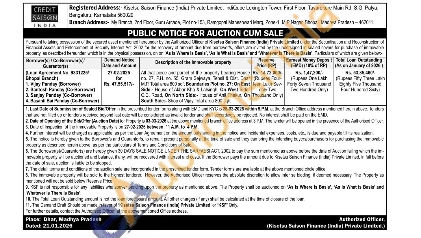 All that piece and parcel of the property bearing House по. 27, Р.Н. по. 55, Gram Sejwaya, Tehsil & Dist. Dhar M.P. Total area 800 sqft Boundaries Plot no. 27: On East Side: House of Akbar Kha & Lalsingh, On West Side-C.C. Road, On North Side: House of Anil Thakur, On South Side:- Shop of Vijay Total area 800 sqft