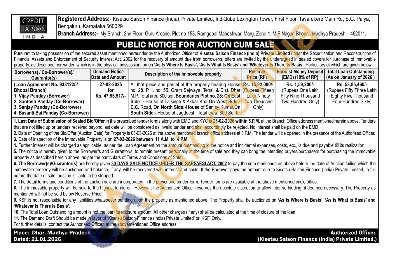 All that piece and parcel of the property bearing House no. 28, P.H. no. 55, Gram Sejwaya, Tehsil & Dist. Dhar M.P. Total area 800 sqft Boundaries Plot no. 28: On East Side: House of Lalsingh & Akbar Kha On West Side: C.C. Road, On North Side:-House of Sanjay Kumar, On South Side:- House of Jagdeesh, Total area: 800 Sq. ft.