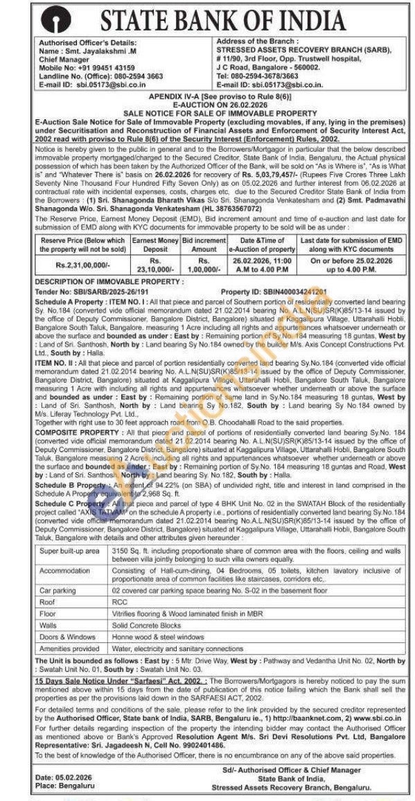 Schedule A Property: ITEM NO. 1: All that piece and parcel of Southem portion of residentially converted land bearing Sy. No. 184 (converted vide official memorandum dated 21.02.2014 bearing No. A.L.N(SU)SR(K)85/13-14 issued by the office of Deputy Commissioner, Bangalore District, Bangalore) situated at Kaggalipura Village, Uttarahalli Hobli Bangalore South Taluk, Bangalore, measuring 1 Acre including all rights and appurtenances whatsoever underneath or above the surface and bounded as under: East by: Remaining portion of Sy. No. 184 measuring 18 guntas, West by Land of Sn. Santhosh, North by: Land bearing By No. 184 owned by the builder M/s. Axis Concept Constructions Pvt Ltd., South by: Halla ITEM NO. : All that piece and parcel of portion residentially converted land bearing Sy No. 184 (converted vide official memorandum dated 21.02.2014 bearing No. ALN(SU)SR(K)85/13-14 issued by the office of Deputy Commissioner, Bangalore District, Bangalore) situated at Kaggalipura Village. Uttarahalli Hobli, Bangalore South Taluk, Bangalore measunng 1 Acre with including all rights and appurtenances whatsoever whether undemeath or above the surface and bounded as under: East by: Remaining portion of same land in Sy.No. 184 measuring 18 guntas, West by Land of Sri. Santhosh, North by: Land bearing Sy No. 182, South by Land bearing Sy No. 184 owned by M/s. Liferay Technology Pvt. Ltd... Together with right use to 30 feet approach road from O.B. Choodahalli Road to the said properties. COMPOSITE PROPERTY: All that piece and parcel of portions of residentially converted land bearing Sy No. 184 (converted vide official memorandum dated 21.02.2014 bearing No. ALNISU)SR(K)85/13-14 issued by the office of Deputy Commissioner, Bangalore District, Bangalore) situated at Kaggalipura Village, Uttarahalli Hobli, Bangalore South Taluk, Bangalore measuring 2 Acres, including all rights and appurtenances whatsoever whether undemeath or above the surface and bounded as under: East by: Remaining portion of Sy No. 184 measuring 18 guntas and Road, West by: Land of Sri. Santhosh, North by: Land bearing Sy No. 182, South by: Hala Schedule A Property equivalent to 2.968 Sq. ft. Schedule B Property: An extent of 194.22% (on SBA) of undivided night, title and interest in land comprised in the Schedule C Property: All that piece and parcel of type 4 BHK Und No. 02 in the SWATAH Block of the residentially project called "AXIS TATVAM' on the schedule A property ie, portions of residentially converted land bearing Sy No.184 (converted vide official memorandum dated 21.02.2014 bearing No.AL.N(SU)SR(K)85/13-14 issued by the office of Deputy Commissioner, Bangalore District, Bangalore) situated at Kaggalipura Wilage, Uttarahalli Hobli, Bangalore South Taluk, Bangalore with details and other attributes given heraunder