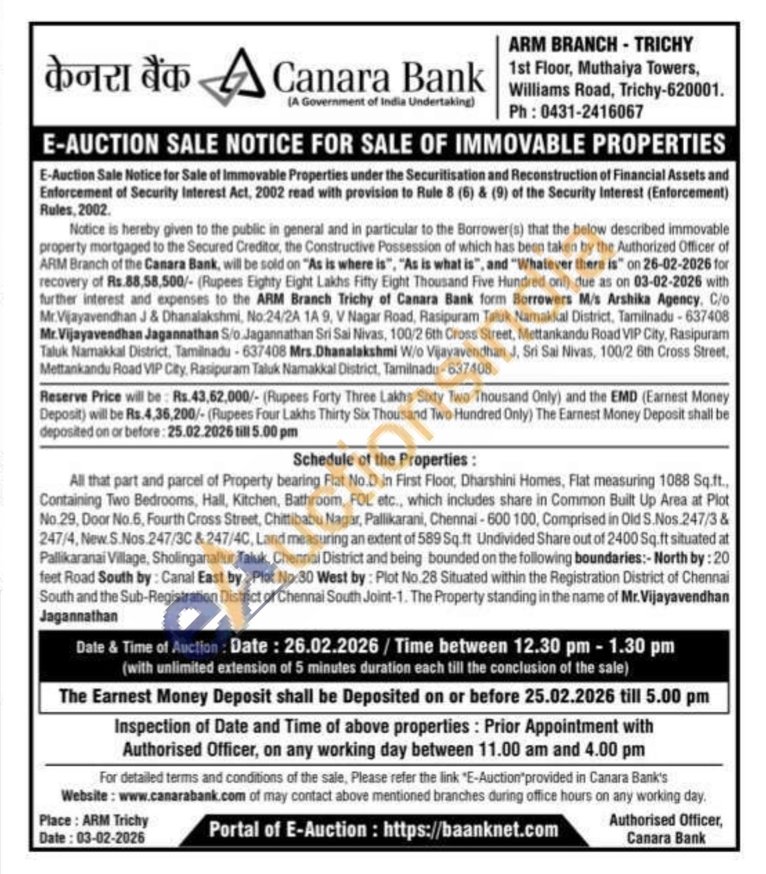 All that part and parcel of Property bearing Flat No.D in First Floor, Dharshini Homes, Flat measuring 1088 Sq.ft., Containing Two Bedrooms, Hall, Kitchen, Bathroom, FOL etc., which includes share in Common Built Up Area at Plot No.29, Door No.6, Fourth Cross Street, Chittibabu Nagar, Pallikarani, Chennai-600 100, Comprised in Old S.Nos.247/3 & 247/4, New.S.Nos.247/3C & 247/4C, Land measuring an extent of 589 Sq.ft Undivided Share out of 2400 Sq.ft situated at Pallikaranai Village, Sholinganallur Taluk, Chennai District and being bounded on the following boundaries:- North by: 20 feet Road South by: Canal East by: Plot No.30 West by: Plot No.28 Situated within the Registration District of Chennai South and the Sub-Registration District of Chennai South Joint-1. The Property standing in the name of Mr. Vijayavendhan Jagannathan