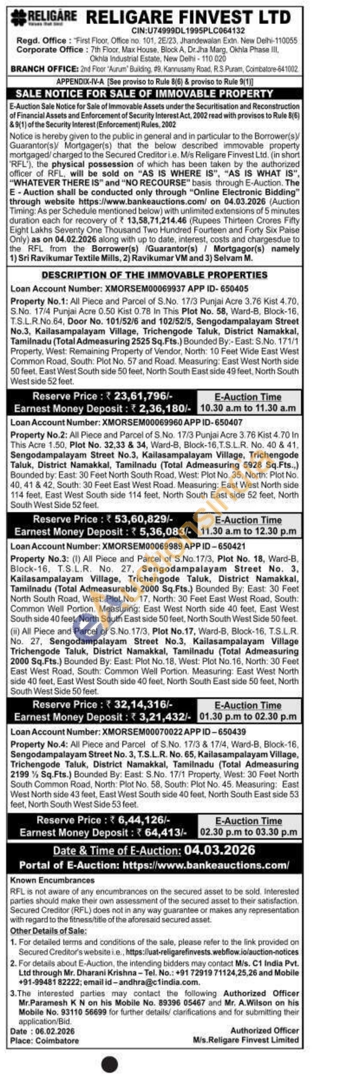 All Piece and Parcel of S.No. 17/3, Plot No. 18, Ward-B. Block-16, T.S.L.R. No. 27, Sengodampalayam Street No. 3. Kailasampalayam Village, Trichengode Taluk, District Namakkal, Tamilnadu (Total Admeasurable 2000 Sq.Fts.) Bounded By: East: 30 Feet North South Road, West: Plot No. 17. North: 30 Feet East West Road, South: Common Well Portion. Measuring: East West North side 40 feet, East West South side 40 feet, North South East side 50 feet, North South West Side 50 feet. (ii) All Piece and Parcel of S.No. 17/3, Plot No.17, Ward-B, Block-16, T.S.L.R. No. 27, Sengodampalayam Street No.3, Kailasampalayam Village Trichengode Taluk, District Namakkal, Tamilnadu (Total Admeasuring 2000 Sq.Fts.) Bounded By: East: Plot No.18, West: Plot No. 16, North: 30 Feet East West Road, South: Common Well Portion. Measuring: East West North side 40 feet, East West South side 40 feet, North South East side 50 feet, North South West Side 50 feet.